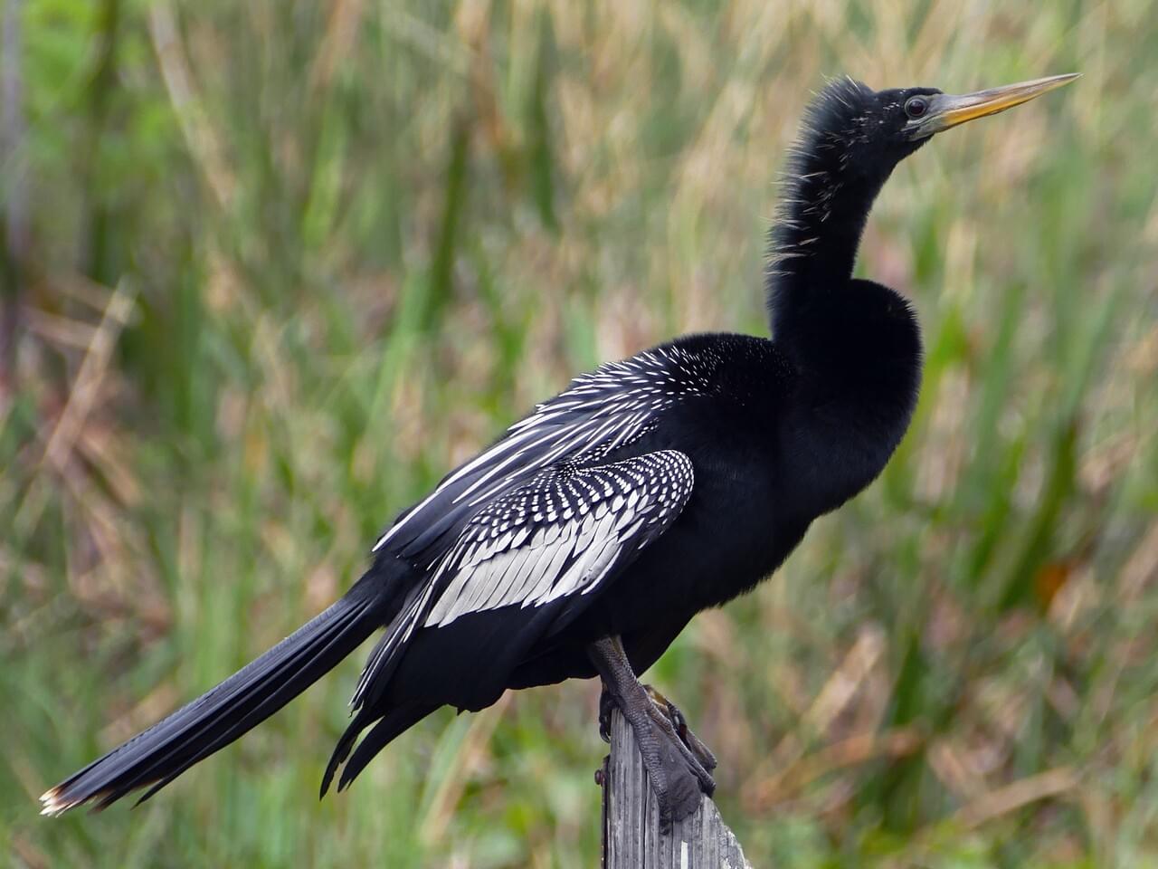 Anhingas and cormorants are both large black aquatic birds often confused for each other, but they have distinct differences. They are similar in size (somewhat smaller than a goose) with wingspans from 3.7 to 5 feet, the cormorant having the larger wingspan. Anhingas are known for their long, slender necks and pointed bills, while cormorants have shorter, thicker necks and hooked bills. Anhingas often swim with their bodies submerged under the water. The anhinga stretches its head and neck out of the surface of the water. When its head and neck are stretched out, it looks like a snake is gliding through the water, hence the nickname “snakebird.” Cormorants, on the other hand, though their bodies are heavy, swim with their bodies more above the water, like a duck.