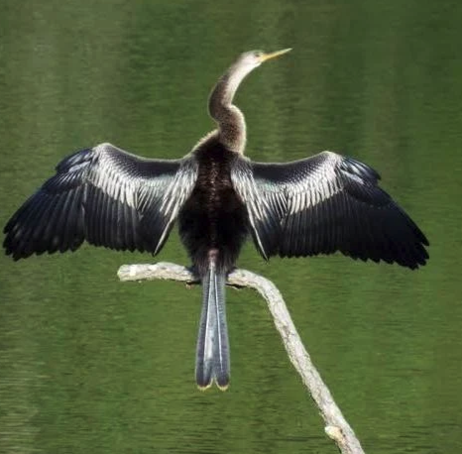 Male anhingas have grayish-black feathers with a greenish shine to them with the upper body spotted or streaked with white. The female has a tan head, neck, and chest, and black stomach. The anhinga has poorly developed oil glands, and its feathers aren’t as waterproof as the feathers of other water birds. It perches in a tree with its wings open to dry its feathers and warm its body.