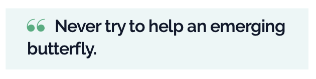 Butterflies have a four-stage life cycle and undergo a complete metamorphosis. Adults lay eggs on plant foliage on which their larvae, known as caterpillars, feed. The caterpillars grow, sometimes very rapidly, and when fully developed, pupate in a chrysalis. When metamorphosis is complete, the pupal skin splits, the adult insect climbs out, expands its wings to dry, and flies off. Never try to help an emerging butterfly. It needs to follow nature and dry out its wings before it can fly.