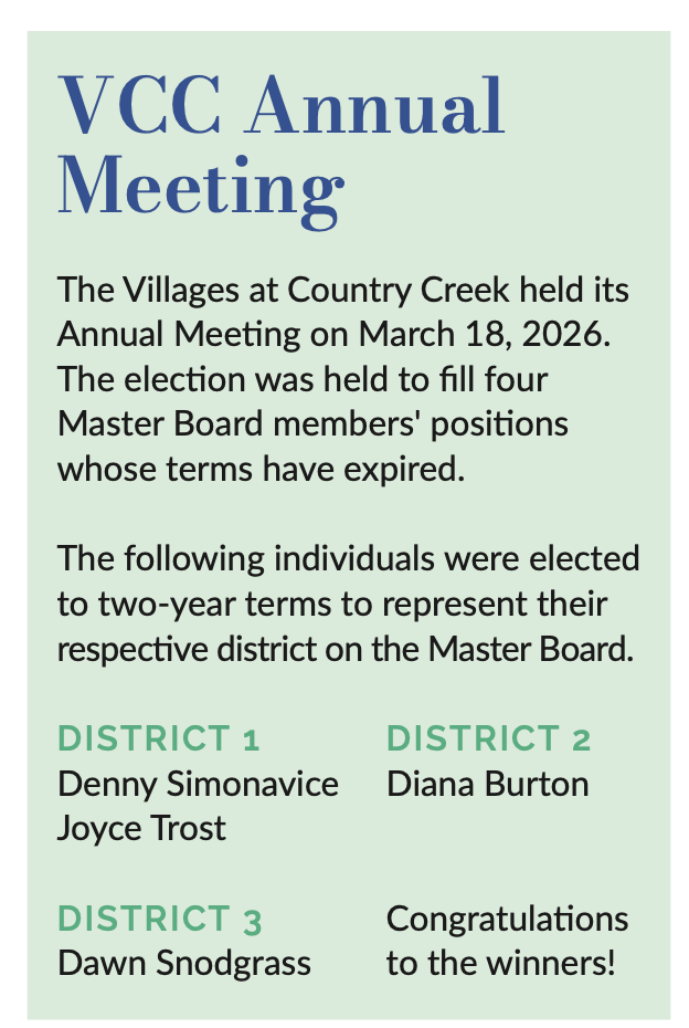 Excitement is growing for the notion of a new look for the interior of our clubhouse. If you weren’t able to attend the Master Board meeting held on March 16, 2026, you may view the presentation given by Roger Harper, Project Manager, at this link. Roger is committed to providing monthly updates about the project to the community. Additionally, the community can view progress of the project via the 24/7 secure cameras. A link to these cameras will be provided on the VCC website.